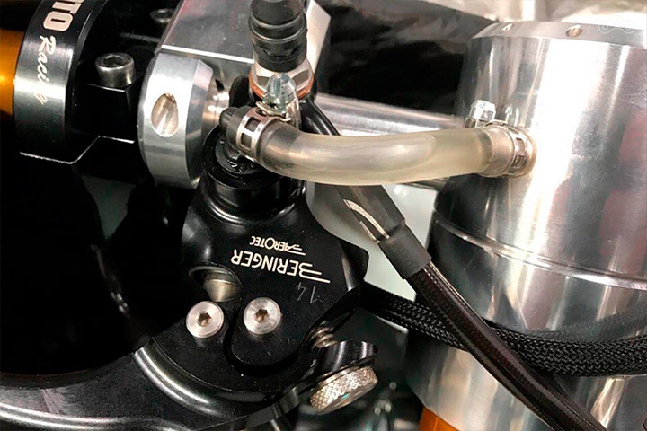 Еще одним бесспорным мотиватором уйти от стокового руля стала инженерная ошибка производителя. Тормозной бачок на данной модели эффектно объединен с креплением клипона на передней траверсе. Но стоит он слишком низко относительно тормозной машинки. При наклоне мотоцикла жидкость перетекает и система хапает воздух.