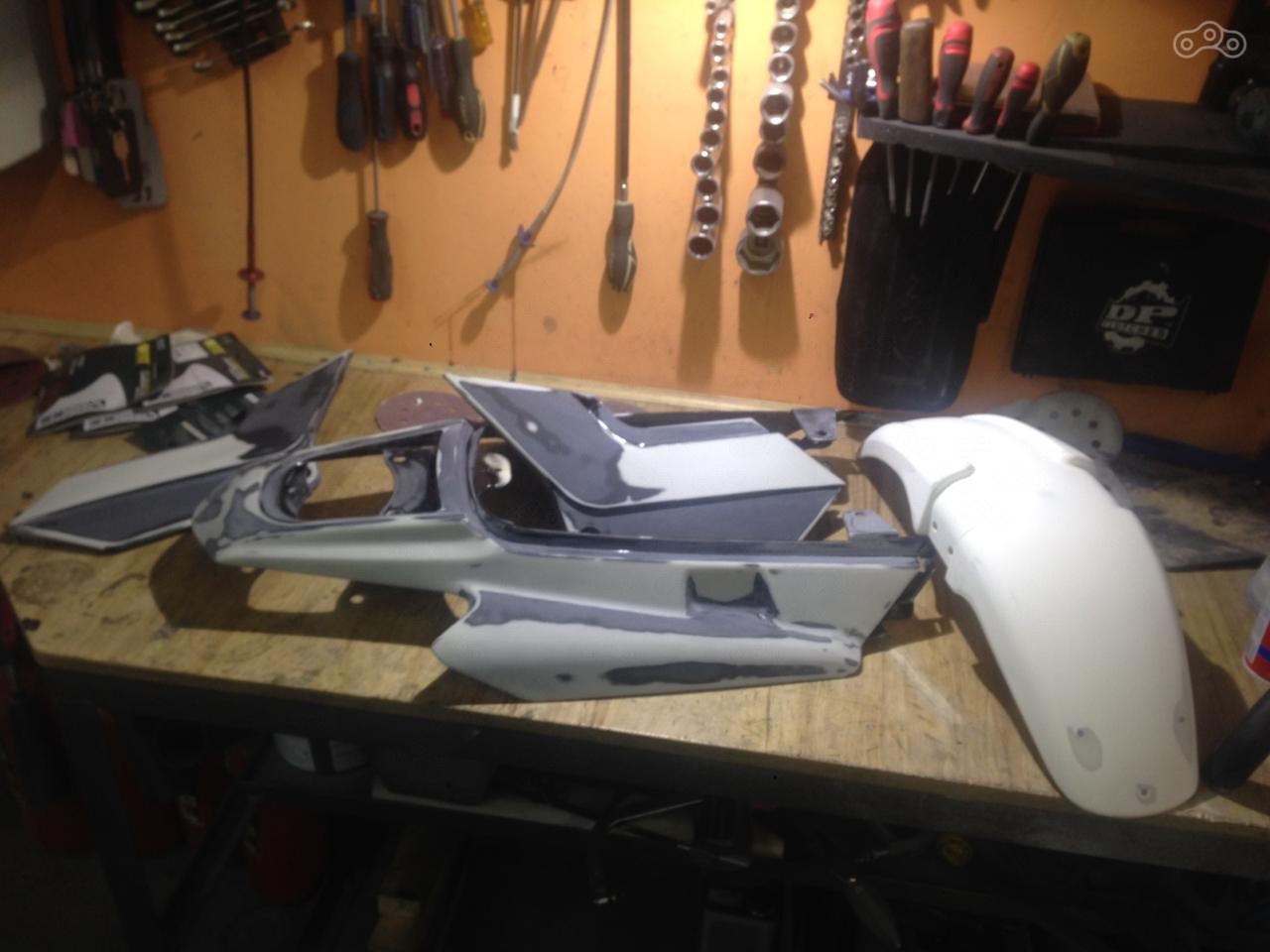 А вот оперение хвоста и переднее крыло пришлось все же отдать малярам, однако с учетом того, что к покраске детали я готовил самостоятельно, за "облить" взяли не много, около трех тысяч. На свое место встала китайская фара со стильной сеточкой и желтым стеклом, массивное заднее крыло сменилось маленьким диодным фонариком, а на глушителе появилась термолента.