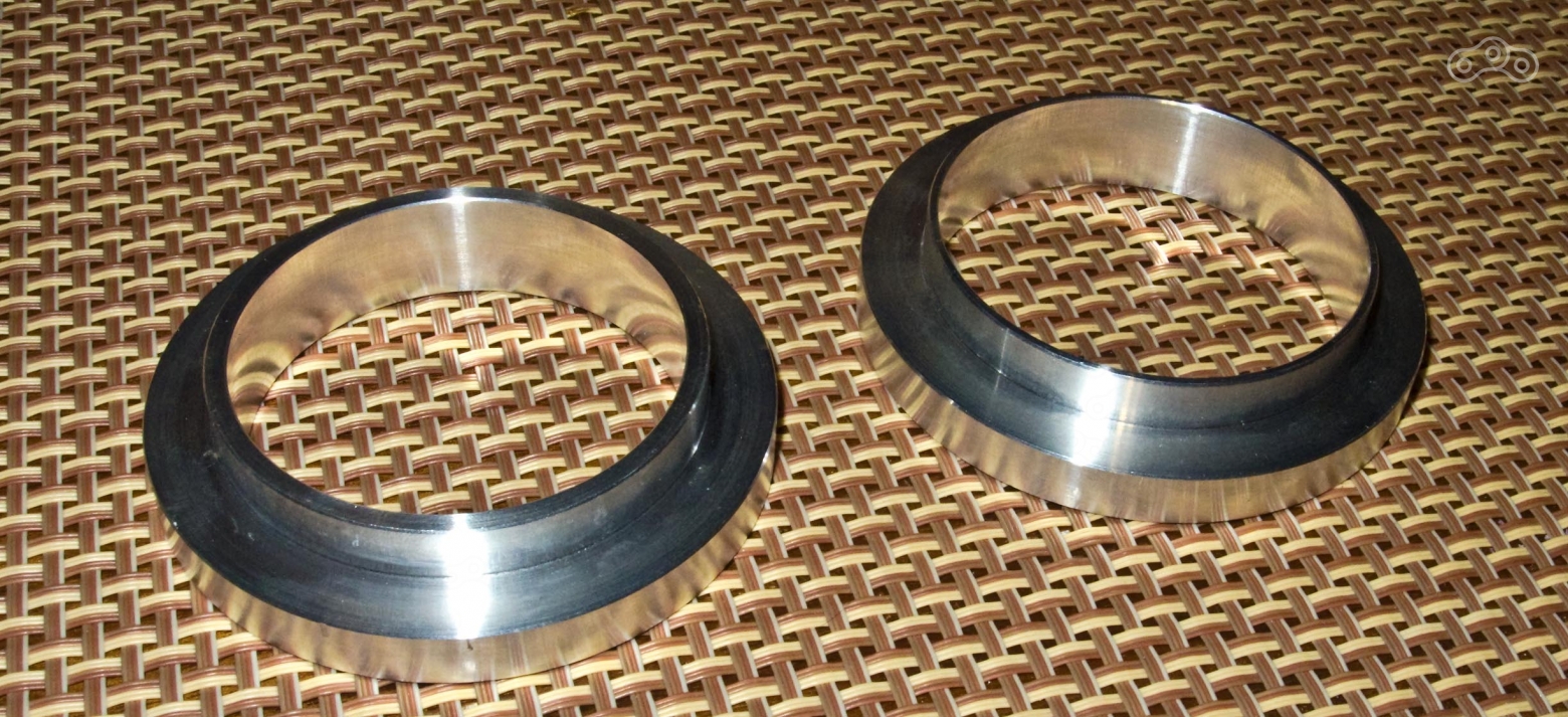 Важный момент - 2.5" это 63.5 мм (у всех нормальных людей), но у Фолкнера это 65 мм. Хорошо, что я заранее уточнил реальные размеры пружины, потому что мне пришлось точить под неё переходники (Racetech кстати под свои пружины тоже переходники предлагает, но стальные). Новая пружина короче стоковой (8" это всего 203 мм). Я сделал два переходника 9 мм толщиной, что позволило компенсировать отсутствие зауженного нижнего витка и меньшую длину пружины, а так же позволило выставлять преднагрузку по значениям из сервис-мануала - новая пружина вместе с переходниками получилась как стоковая по длине. Чертежи переходников из алюминия прилагаю. Если делать из стали, то верхний можно потоньше сделать. С двумя толстыми переходниками 9" пружина не влезет - резьбы на аморте не хватит.
